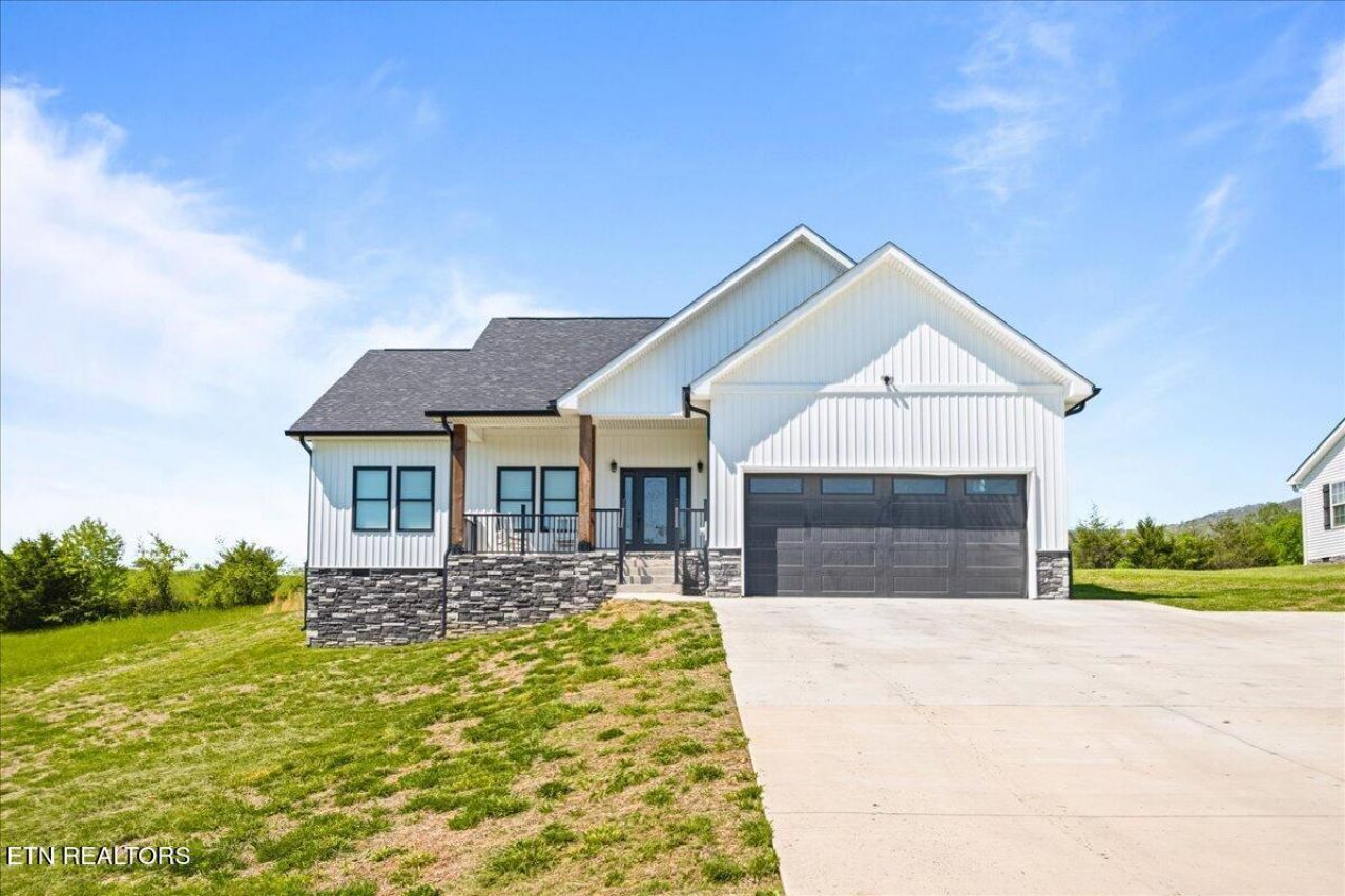 Welcome to this beautifully crafted 3-bedroom, 2-bath home built in 2022, perfectly situated in LaFollette with stunning mountain views and unbeatable convenience. Nestled on over a half acre at the base of the Cumberland Mountains, this property offers the ideal blend of modern comfort and outdoor lifestyle. Step inside to find a thoughtfully designed split floor plan featuring vaulted ceilings, durable LVP flooring, and a cozy fireplace that anchors the main living space. The kitchen is a standout with granite countertops, stainless steel appliances, and ample cabinetry--perfect for both everyday living and entertaining. The spacious primary suite offers a relaxing retreat with a tiled walk-in shower, double vanity, walk-in closet, and stylish barn door accents. Additional highlights include walk-in closets, and a large laundry room for added convenience. Outside, enjoy a concrete driveway, 2-car garage, and a private patio area complete with a newly installed retaining wall--ideal for relaxing or hosting gatherings. The property also includes a matching storage shed for extra space. Located less than 10 minutes from Norris Lake and just minutes from popular ATV riding trails, this home is perfect for those who love both tranquility and adventure. Don't miss your chance to own this move-in ready home in one of the area's most desirable settings! All information is approximate. Buyer should verify all.